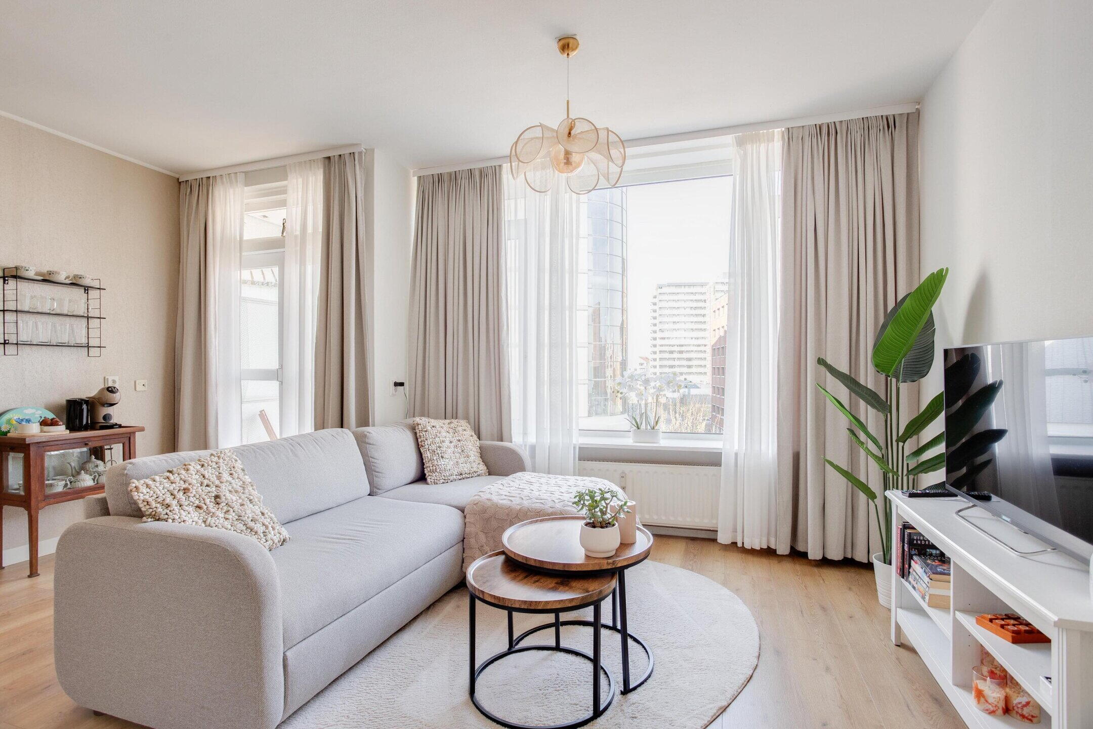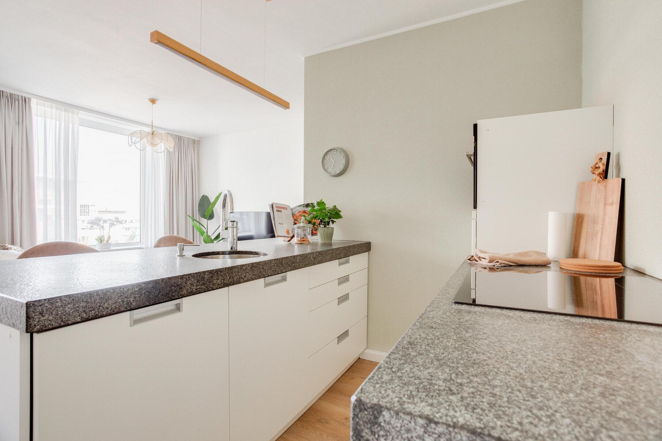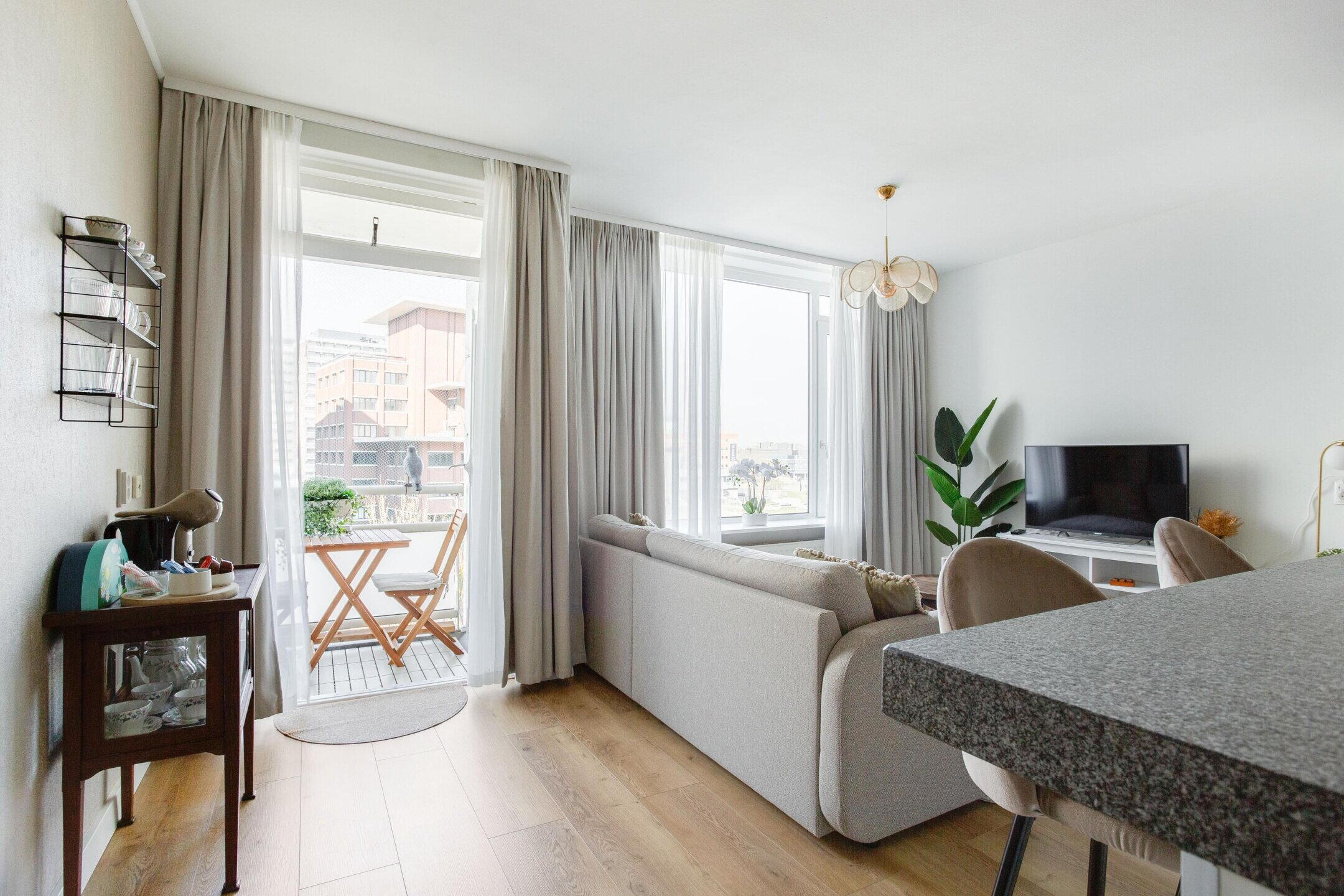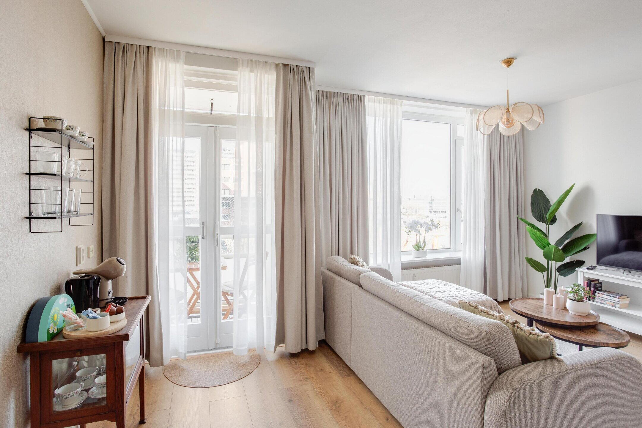 De studio is praktisch opgezet met één open ruimte voor wonen en slapen, waardoor het geheel ruimtelijk en overzichtelijk aanvoelt. De aparte keuken zorgt ervoor dat koken en leven prettig van elkaar gescheiden zijn. Grote raampartijen brengen veel daglicht binnen en geven toegang tot het balkon. Dit balkon is misschien compact, maar zeker bruikbaar en bovendien gericht op de avondzon — een fijne plek om de dag af te sluiten.