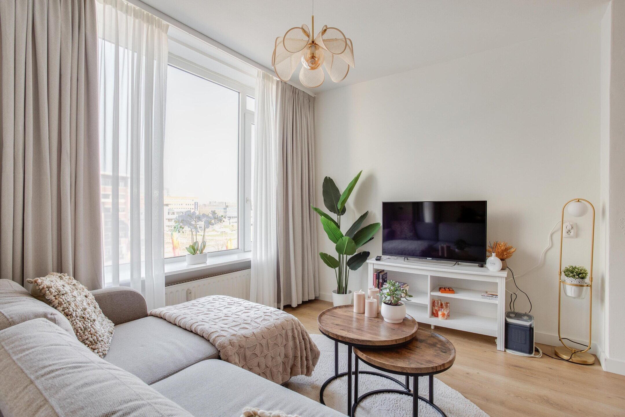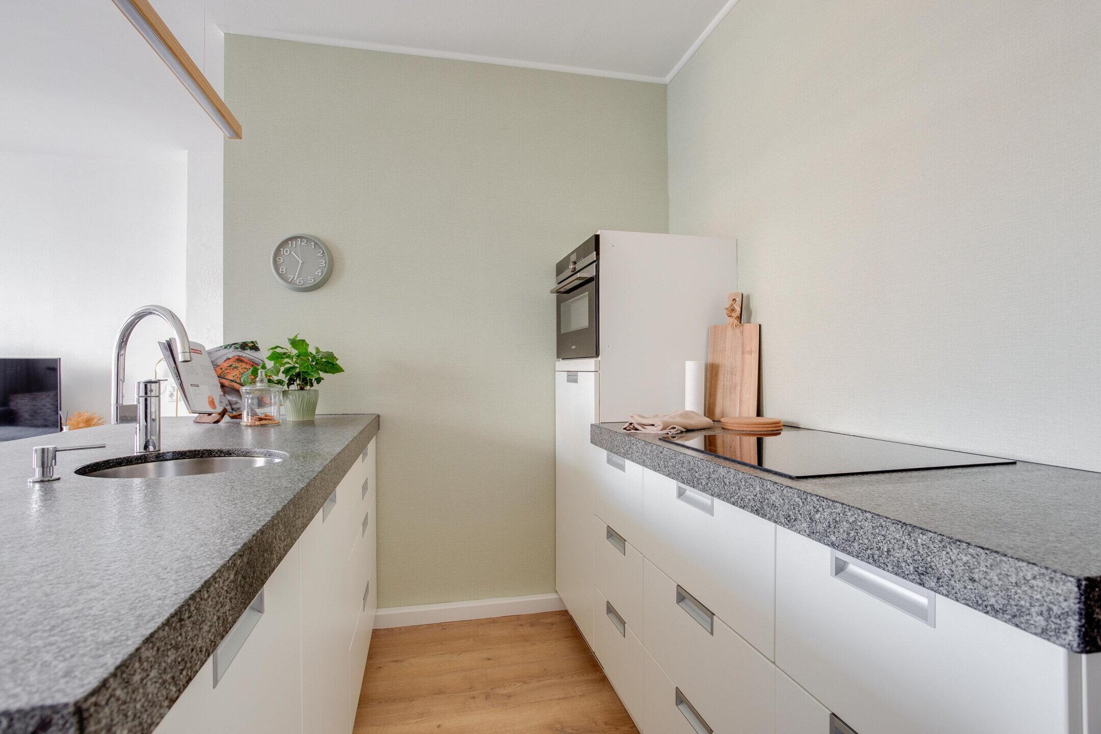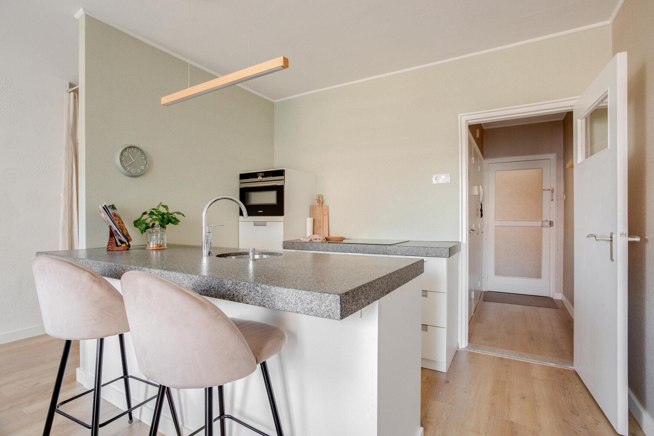 De studio is praktisch opgezet met één open ruimte voor wonen en slapen, waardoor het geheel ruimtelijk en overzichtelijk aanvoelt. De aparte keuken zorgt ervoor dat koken en leven prettig van elkaar gescheiden zijn. Grote raampartijen brengen veel daglicht binnen en geven toegang tot het balkon. Dit balkon is misschien compact, maar zeker bruikbaar en bovendien gericht op de avondzon — een fijne plek om de dag af te sluiten.